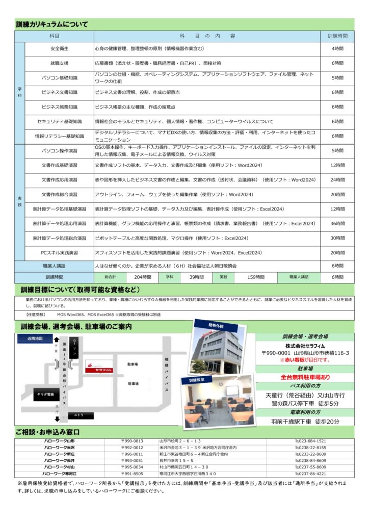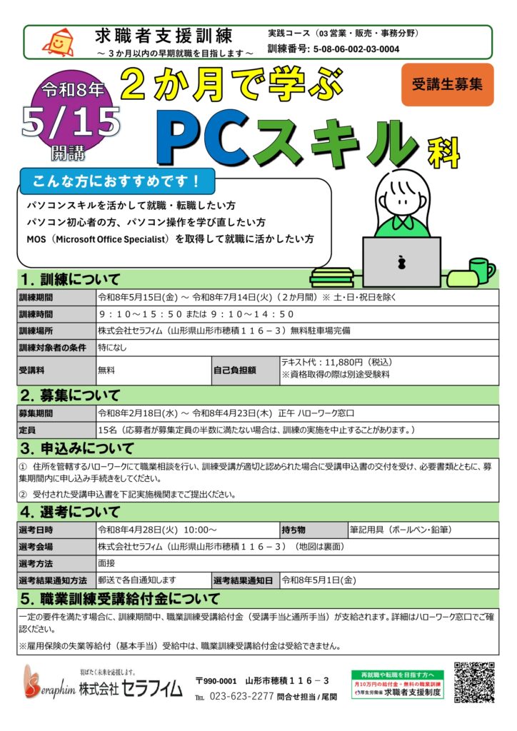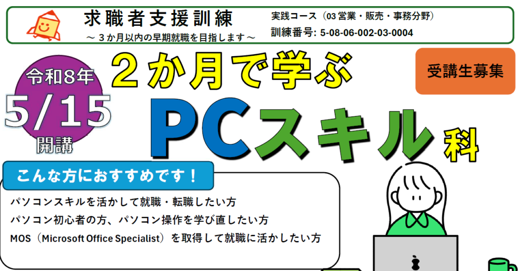 株式会社セラフィムの「2か月で学ぶ PCスキル科」では、2か月という訓練期間の中で、ビジネスの現場では欠かせないWordとExcelを基礎からしっかりと学ぶことができます。